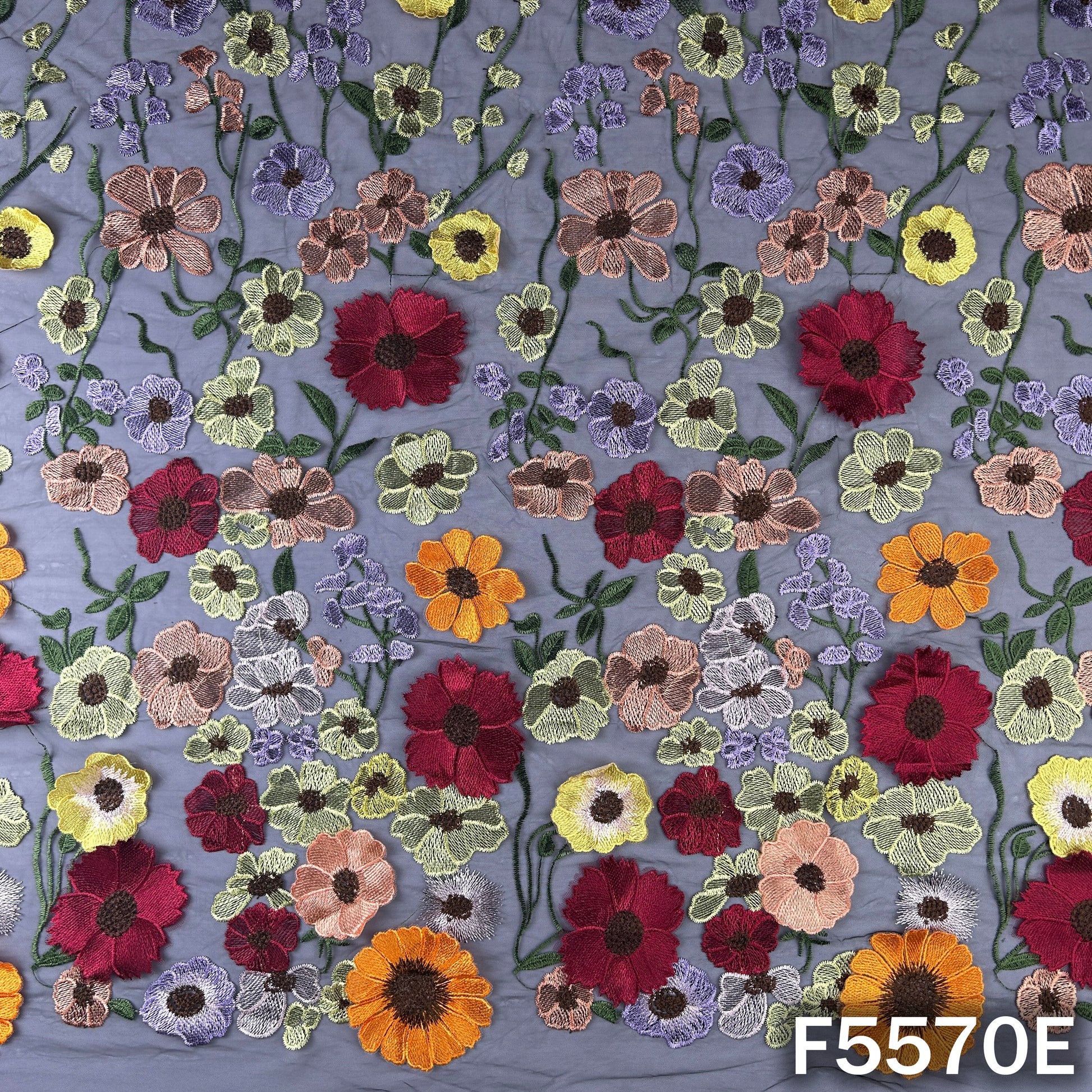 Vibrant net fabric featuring intricate multicolor floral applique work, perfect for statement ethnic and festive outfits.