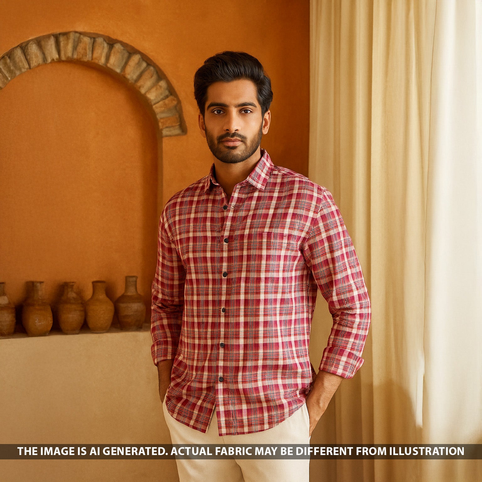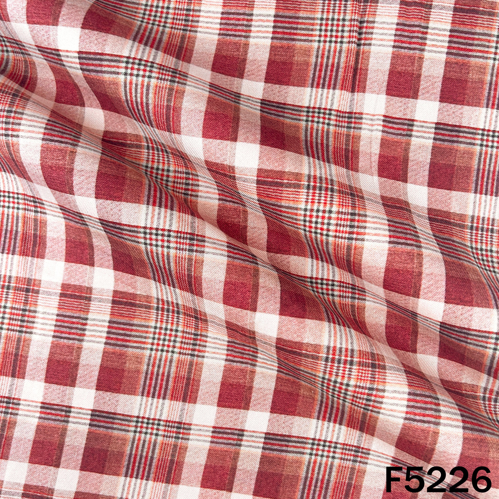 • Soft spun fabric with a classic check pattern in shades of red, cream, and brown. The fabric features a smooth texture and comfortable drape, ideal for crafting stylish shirts, dresses, and everyday wear with a timeless appeal.