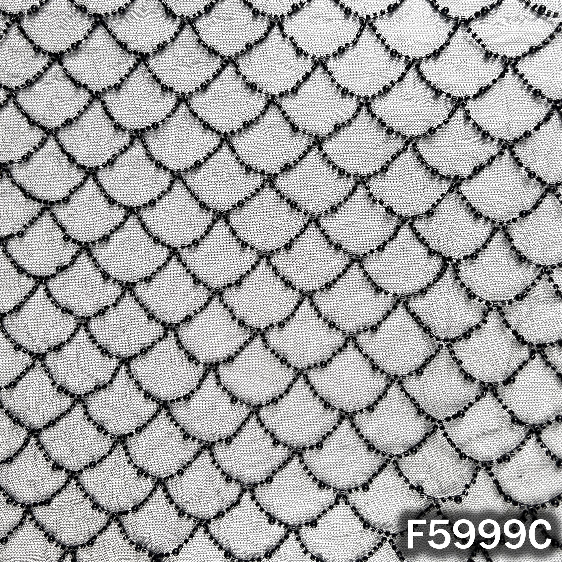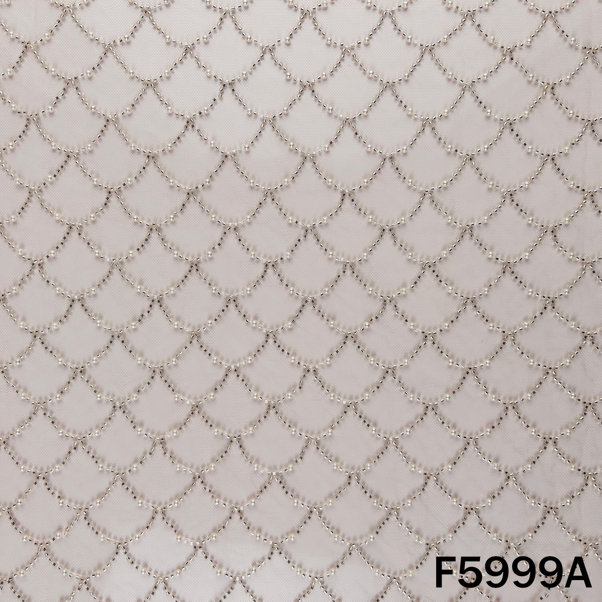 • Elegant net fabric beautifully embellished with intricate cut dana and pearl embroidery in a stylish scallop pattern. Lightweight and sheer with a refined shimmer, this fabric offers a luxurious designer look while maintaining a soft drape.
