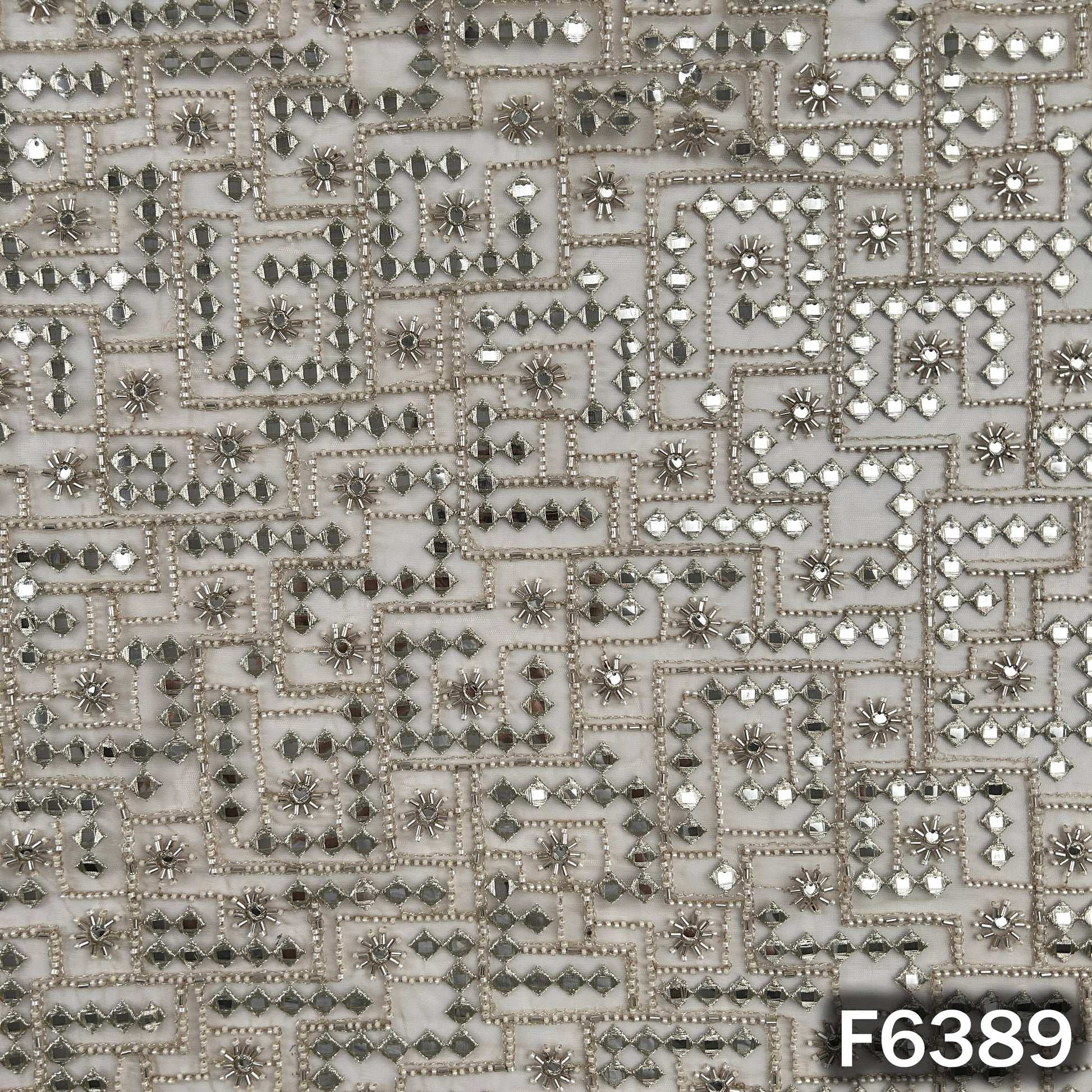 • Premium net fabric with heavy cut dana, zari, and sequins embroidery in an intricate geometric pattern. Rich, detailed, and perfect for bridal wear, lehengas, and statement festive outfits.