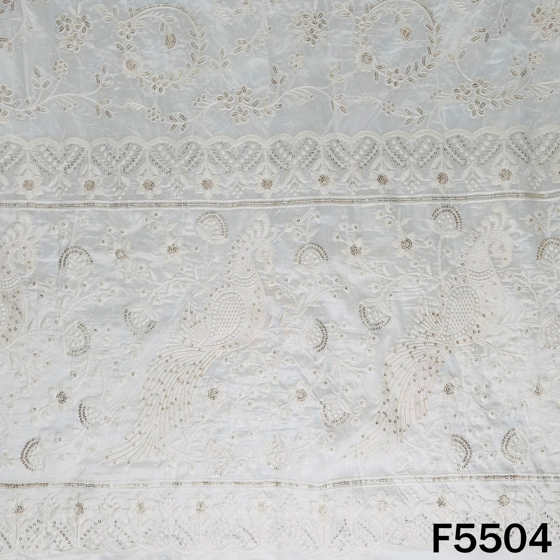 A dyeable raw silk fabric adorned with intricate thread and sequin embroidery, featuring elegant motifs and detailed borders. It has a rich texture with a soft sheen, making it ideal for creating premium ethnic wear, festive outfits, and statement ensembles.