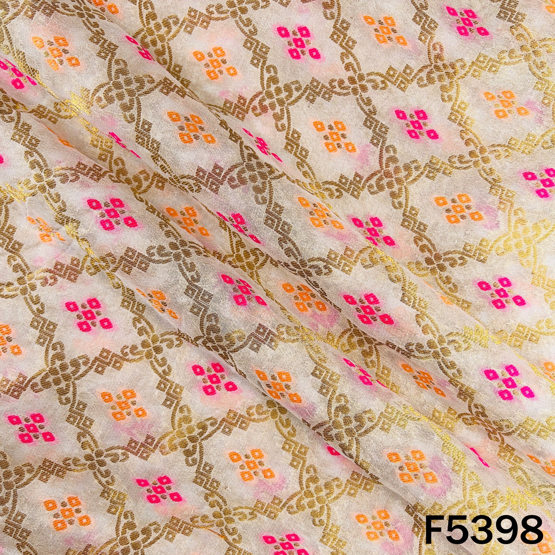 • A soft and flowy georgette fabric featuring elegant dyeable zari work with beautifully detailed motifs. Its lightweight drape, subtle texture, and intricate patterning make it ideal for sarees, suits, lehengas, dupattas, and festive or bridal ensembles. Perfect for custom dyeing to match any design or theme.