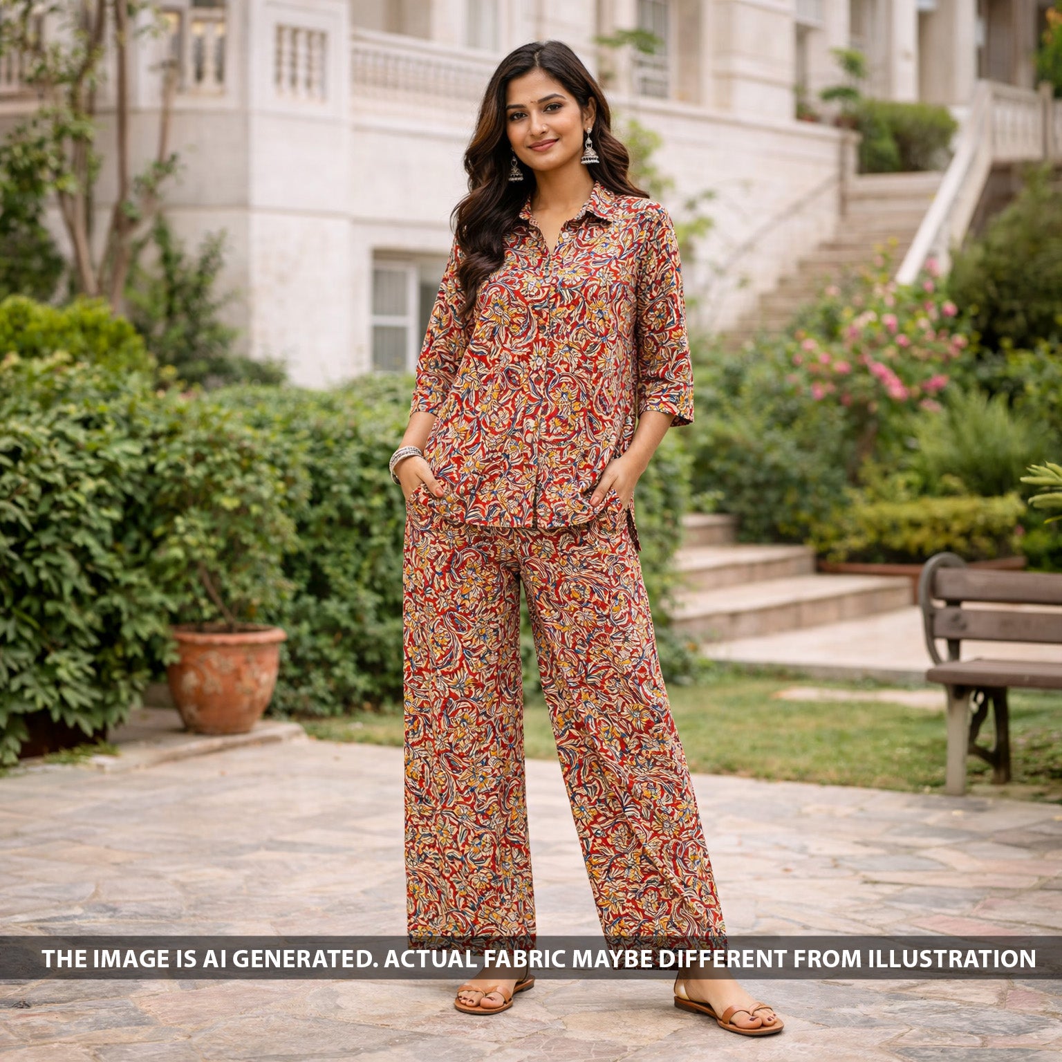 • Traditional handloom cotton fabric featuring beautiful Kalamkari-inspired floral prints in rich red tones. The intricate hand-drawn style motifs with earthy color combinations give the fabric a classic ethnic charm.