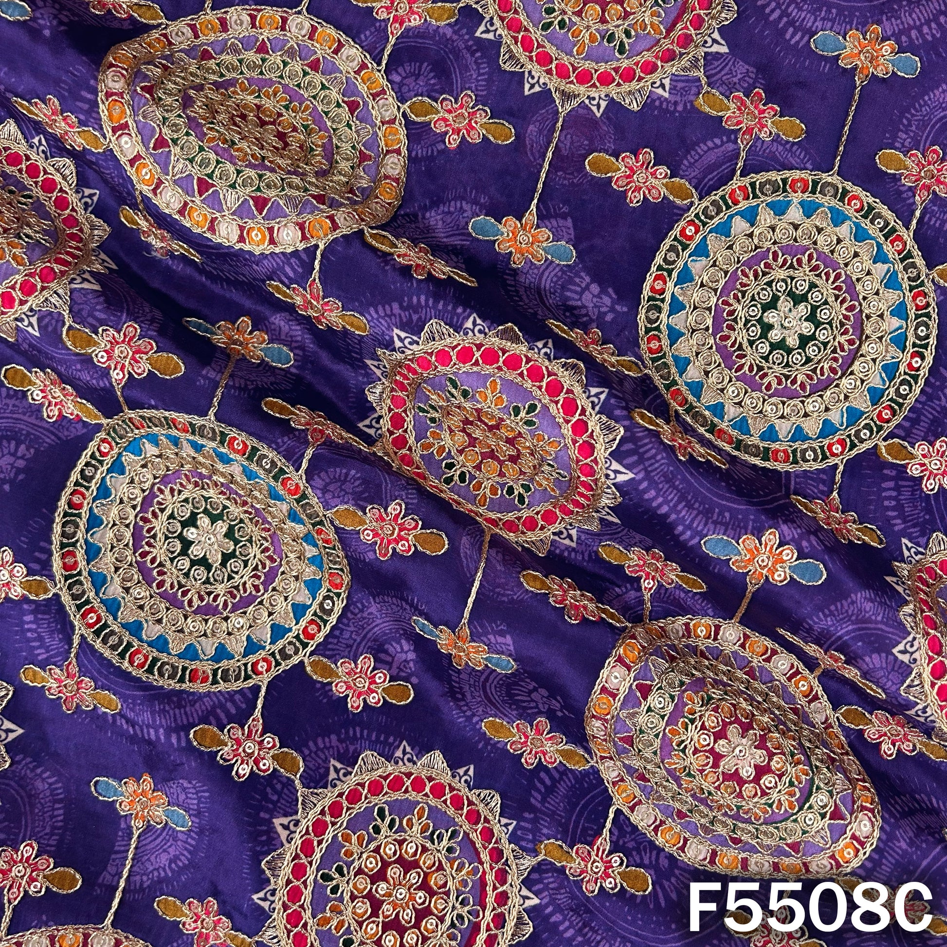 • This positional print crepe fabric features intricate zari and sequin embroidery arranged in beautifully detailed circular motifs, creating a rich festive look. Soft, flowy, and vibrant, it is ideal for statement lehengas, suits, and occasion-wear ensembles.