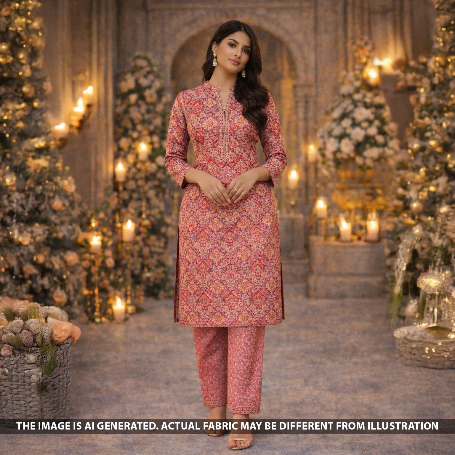 • A premium self jacquard tissue fabric featuring elegant woven patterns with a subtle sheen. Perfect for coordinated top and bottom sets, ideal for festive and occasion wear.