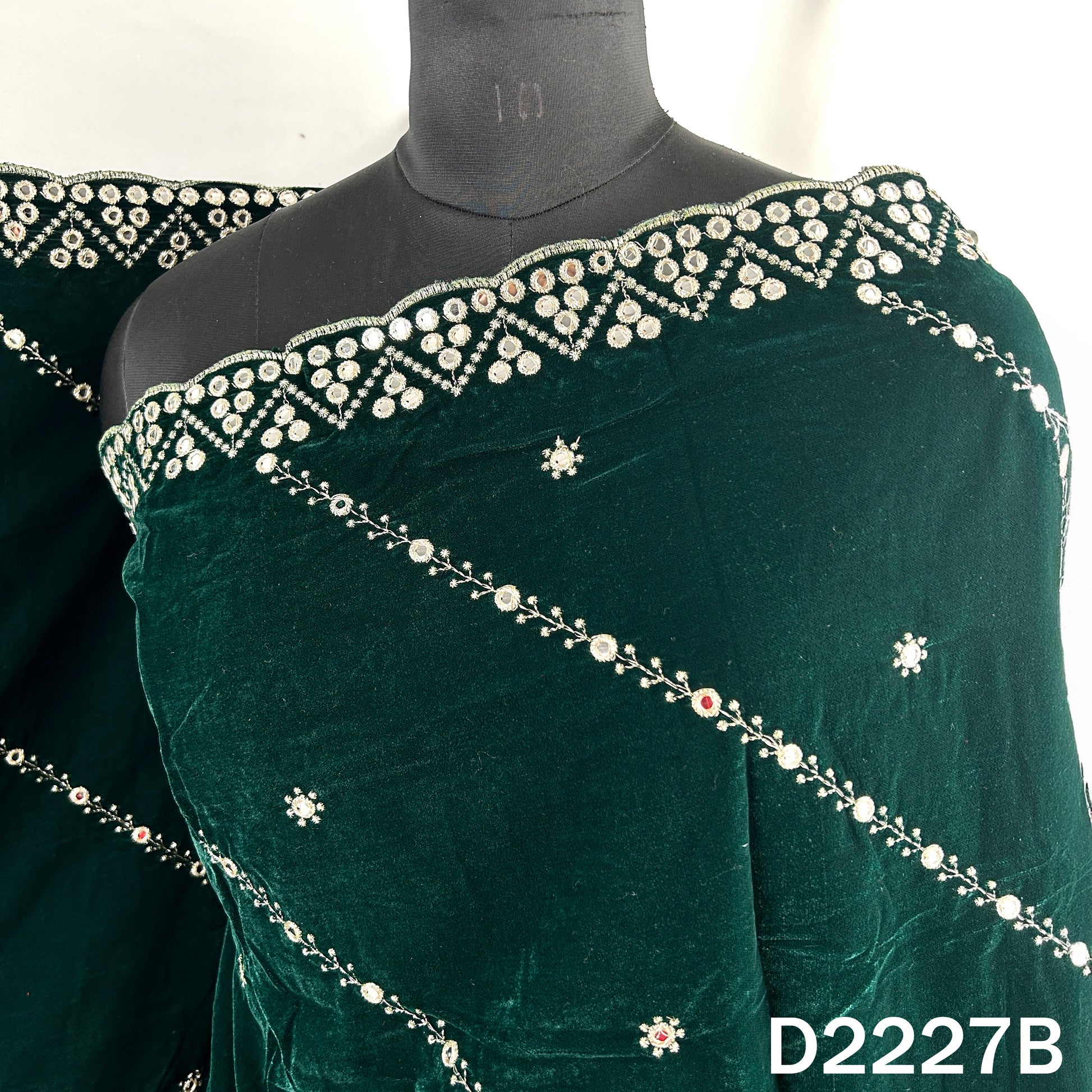 • Exquisite velvet dupatta featuring intricate zari embroidery and stunning mirror work. The rich craftsmanship and detailed border design make it a perfect addition to festive and traditional ensembles.
