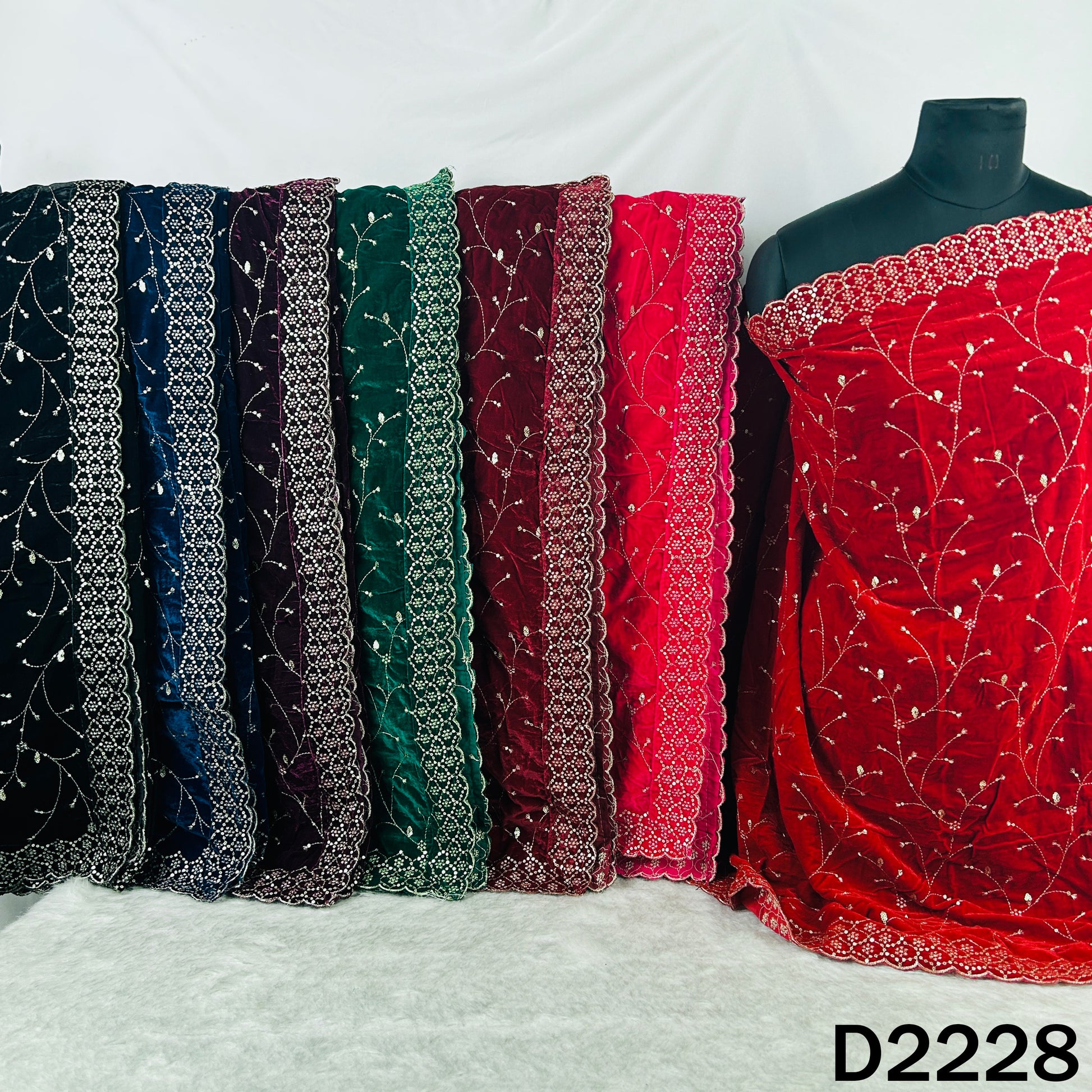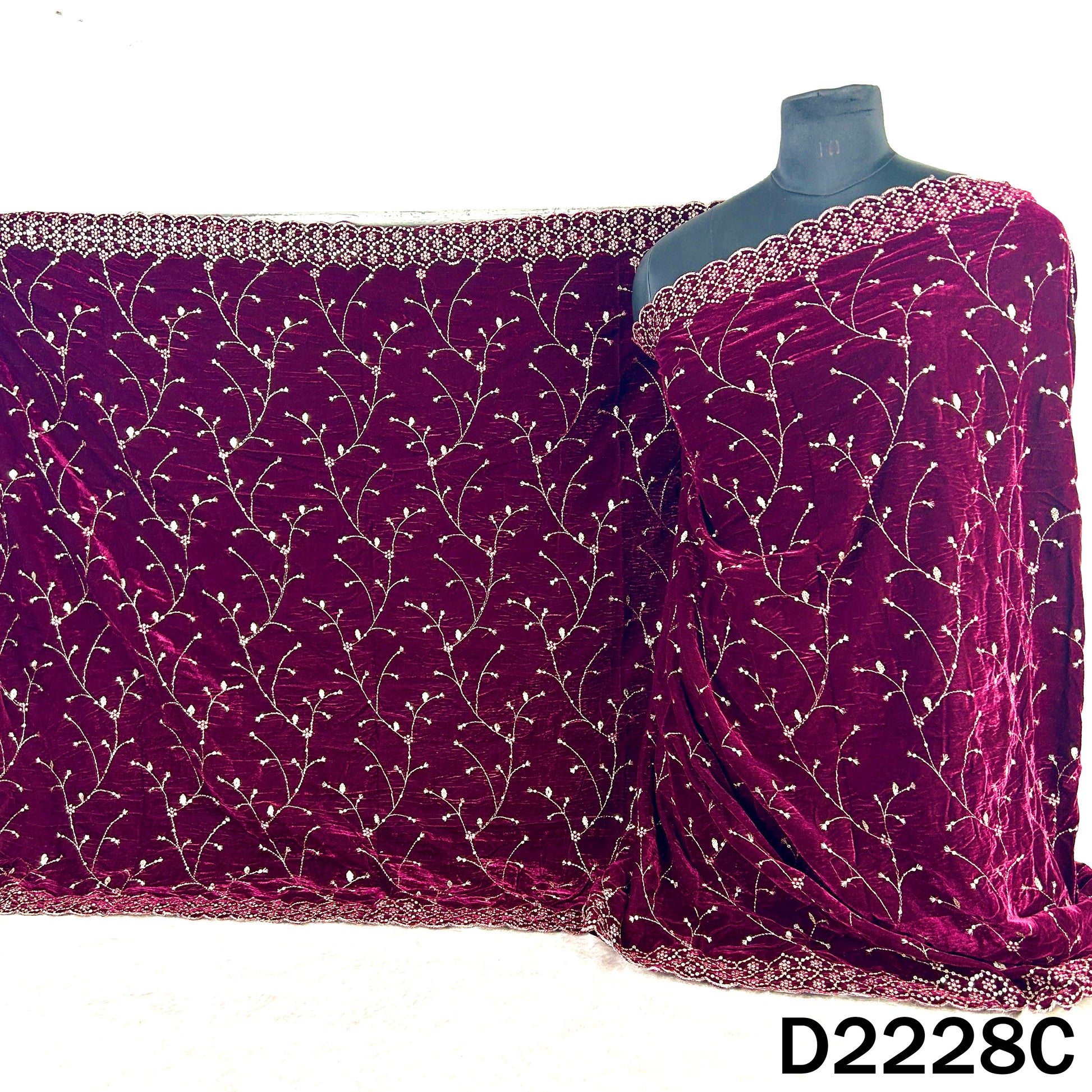 • This Zari Sequins Embroidered Velvet Fabric embodies luxury and sophistication. With its intricate zari and sequin detailing on rich velvet, it’s perfect for festive outfits, evening wear, and bridal creations. A timeless blend of traditional craftsmanship and modern elegance, designed to make every ensemble stand out.