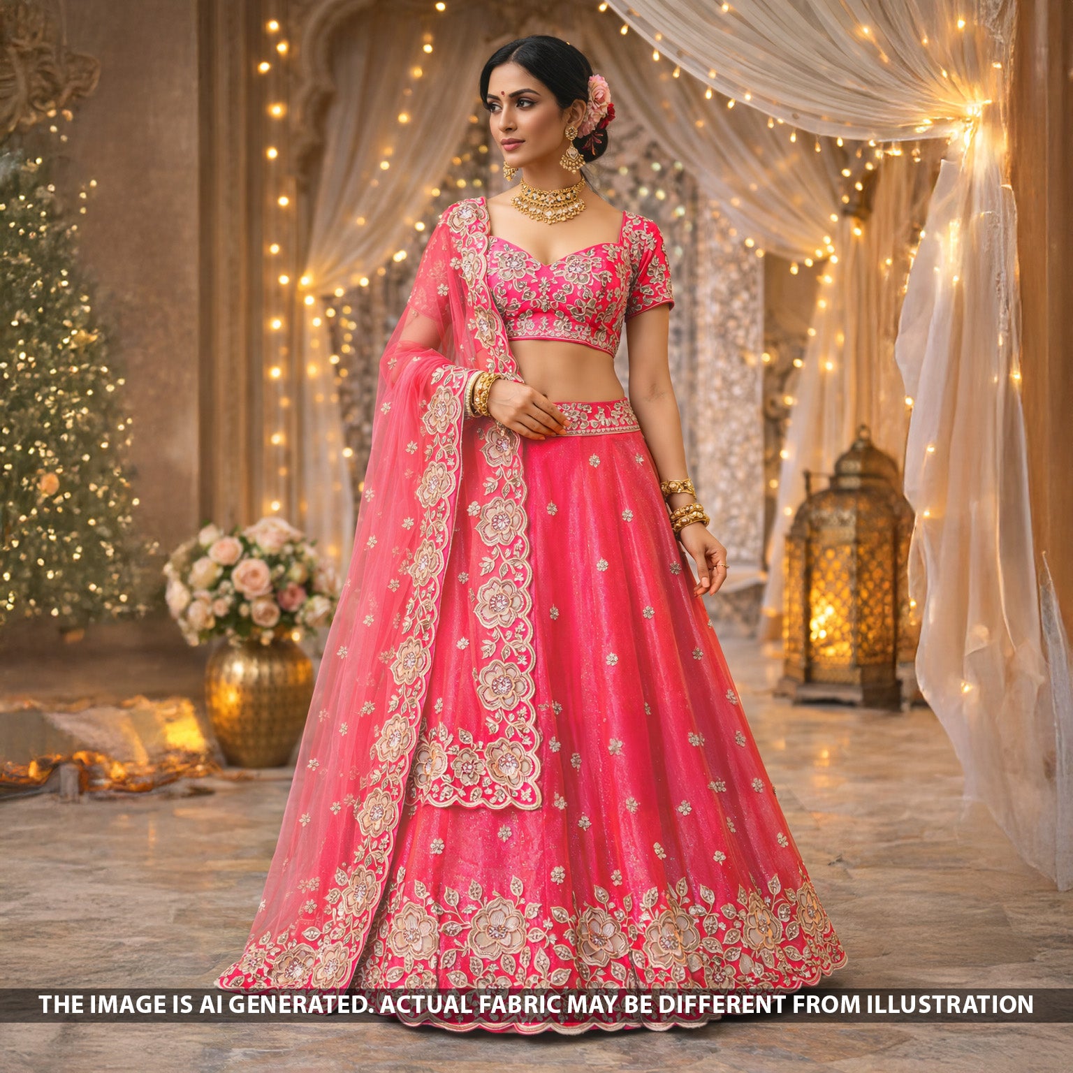 • A luxurious shimmer tissue fabric featuring zari, sequins, and faux mirror net patch work, finished with intricate floral detailing—perfect for festive and statement outfits.