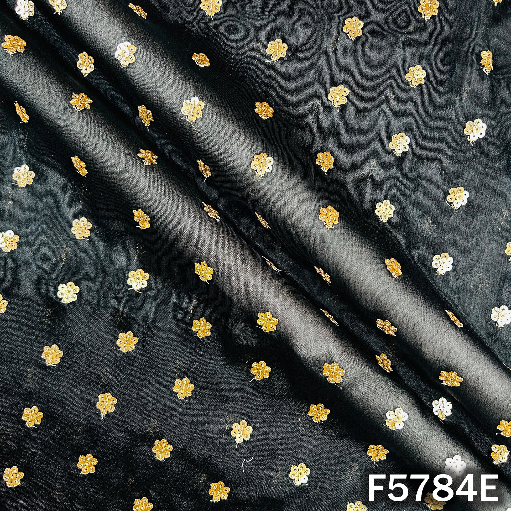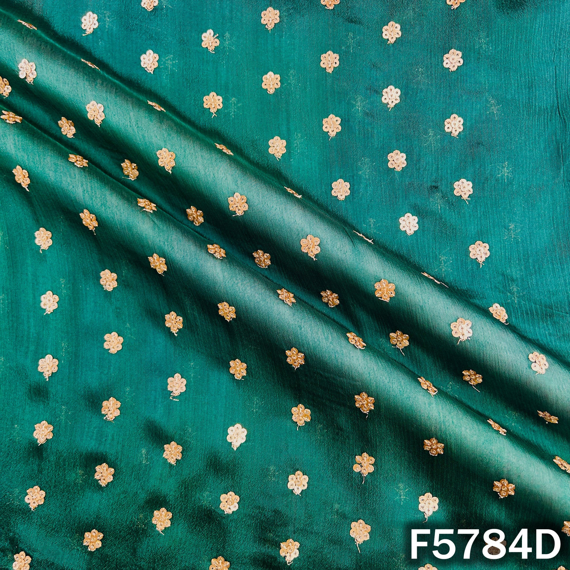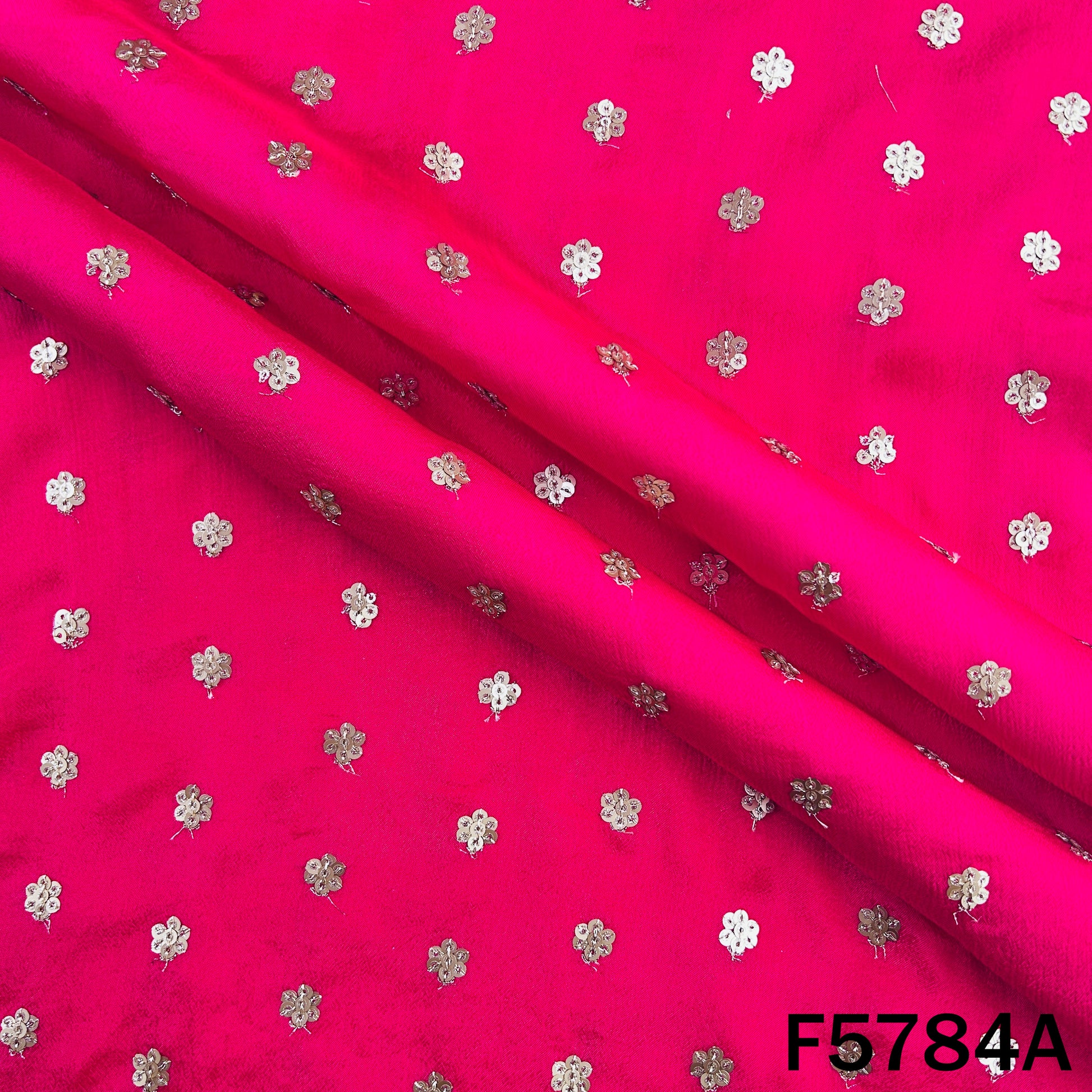 Lightweight Chinnon Chiffon fabric adorned with delicate zari sequins work, offering a soft flow and elegant shimmer. Perfect for festive suits, sarees, dupattas, and graceful ethnic wear.