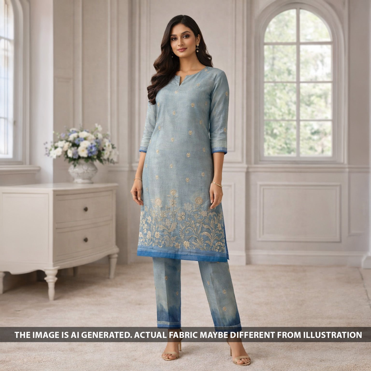 • Elegant tissue fabric beautifully enhanced with delicate zari and sequins work, giving it a subtle shimmer and luxurious festive appeal. The lightweight tissue base creates a graceful shine while the scattered zari motifs add a refined traditional touch.