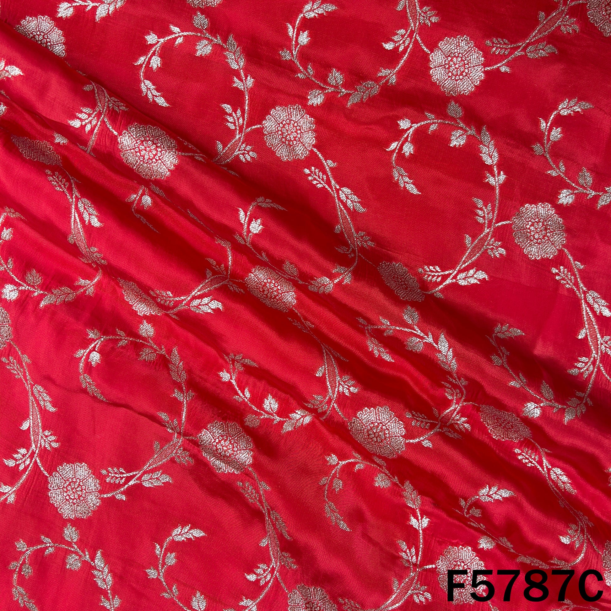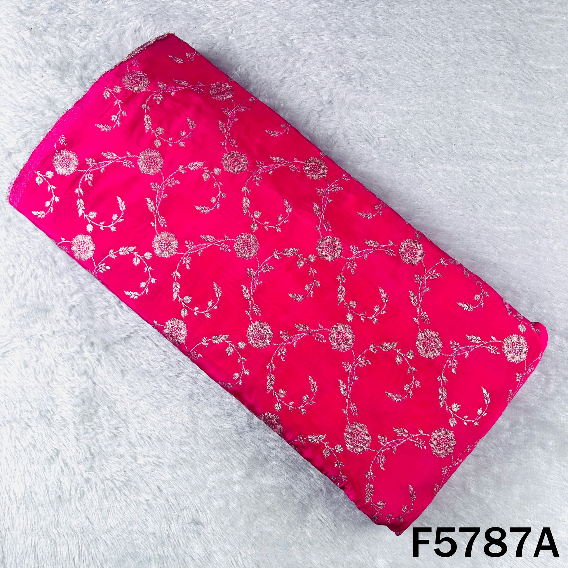 • Rich Banarasi silk fabric featuring intricate zari floral weaving on a luxurious base. Perfect for elegant sarees, lehengas, suits, and festive or wedding wear.